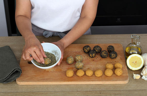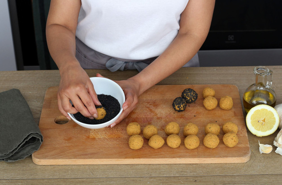 Roulez la 1ère partie de boulettes de falafel dans le sésame noir.