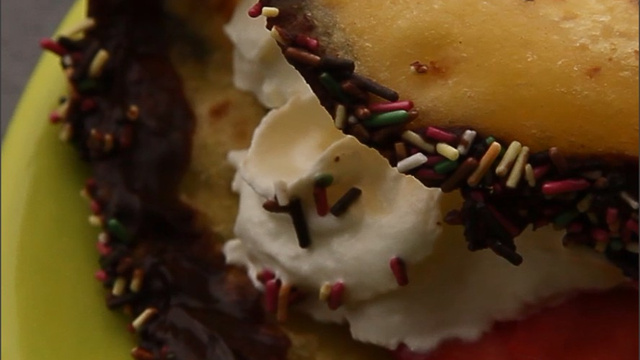 Dans une seconde tortilla au préalable trempée dans le chocolat et les vermicelles, disposez des lamelles de fraises et de la chantilly.