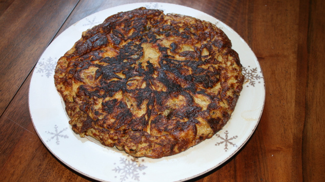 - 4Faites chauffer une poêle, versez de l'huile d'olive et versez le mélange, tassez bien l'omelette.Baissez le feu et déposez dessus une assiette ou un couvercle reposant sur l'omelette et poursuivez la cuisson une vingtaine de minutes à feu trés doux.