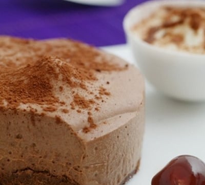 Versez l'appareil dans un cercle à gâteau, dont le fond aura été garni du biscuit au chocolat.