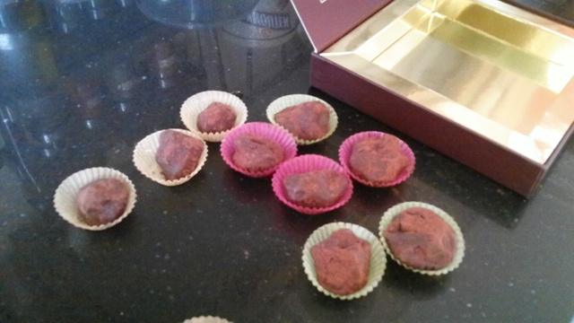 Une fois la pâte durcie, faire des petites boule puis les rouler dans du cacao en poudre. Il faut ensuite se dépêcher de les remettre au frigo car elles peuvent se ramollir.