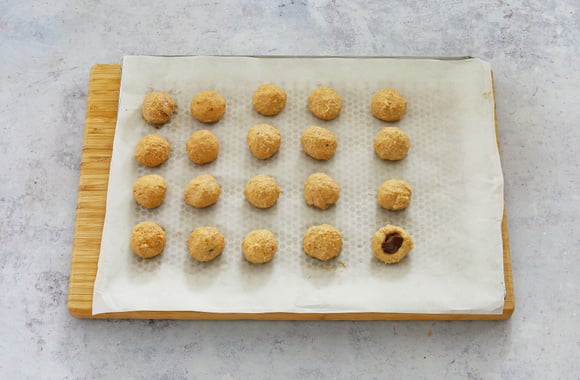 Recouvrez la pâte à tartiner avec un petit peu de pâte et roulez de nouveau en boulettes de la taille d'une petite noix. Posez les boulettes au fur et à mesure sur une plaque recouverte de papier sulfurisé.
