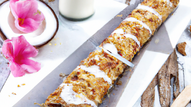 Une tuile caramélisé enroulé pour former un tube qui sera garni d'une salade de fruits exotiques finements taillés et d'une émulsion à la noix de coco.