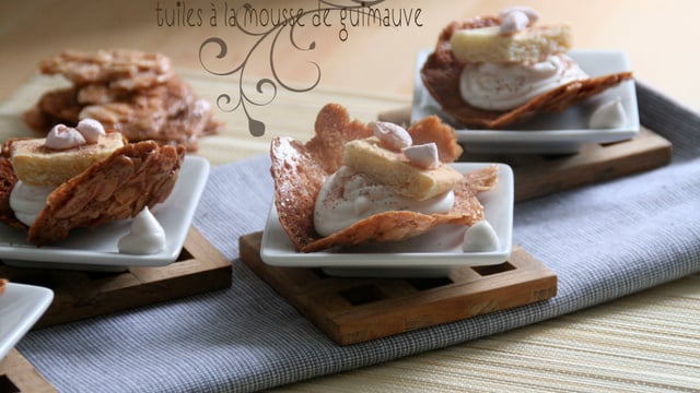 Sur une feuille de papier cuisson, déposez des cuillerées de pâtes en les espaçant bien puis aplatissez les à l'aide d'une cuillère et enfournez à four chaud (150°C) pendant 20 minutes. A la sortie du four, quand les tuiles dont encore chaudes, modelez-les à l'aide de moules à tartelette et laissez refroidir.