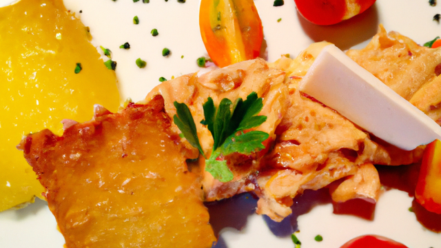 Garnir les tuiles de rillettes d'esturgeon et les accompagner de la tombée de tomates et de pleurotes.