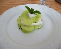 - 1- Peler et couper le concombre en petit dès.saler-les légèrement et faites-les égoutter 10 min.2- Dans un saladier, mélanger le fromage blanc, la crème, l'huile, le jus de citron, ajouter l'ail et poivrer.3- Ajouter les dès de concombre, la menthe préablement.hachée.Mélanger et réserver au frais.
