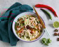 Les udons se marient parfaitement avec les verdures fraîches et le poulet parfumé.