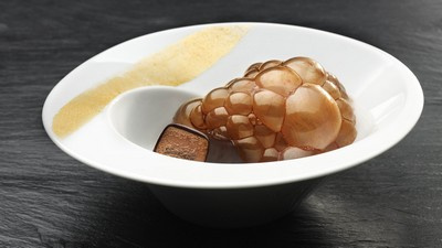 Ainsi on créera des bulles de cacao pleines de la fumée. Avec aide d'une écumoire, reprendre les bulles et les placer dans l'assiette de façon à ce qu'elles couvrent l'ensemble créé. Servir immédiatement. Les bulles crèveront devant le convive.