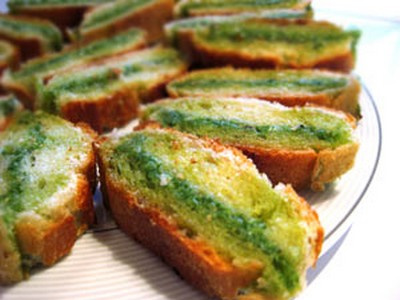 - Couper la ½ baguette d'un seul côté, dans le sens de la longueur et étaler le pesto.
