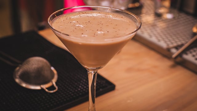 Je prépare de la glace pilée que je place dans le mixer avec tous les ingrédients. Je mixe puis je sers dans un tumbler. Je décore avec quelques noisettes.