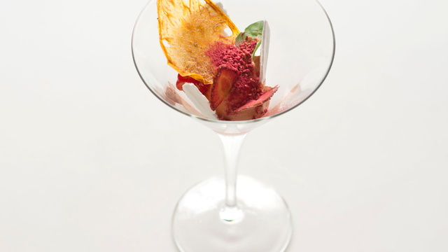 Placer dans chaque verre une boule de glace vanille-tomate, 1 tranche de tomate séchée, 2 morceaux de meringue et terminer par la poudre de framboises séchées et 1 à 2 feuilles de basilic.