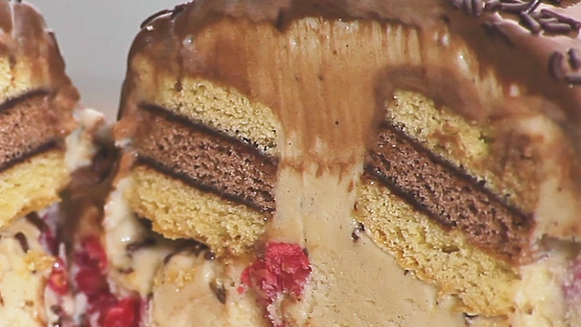 Au bout de deux heures, sortir le vacherin du congélateur, le retourner et le démouler sur une assiette ou un plat. Verser le chocolat pour recouvrir le vacherin et remettre au congélateur encore 2 heures.