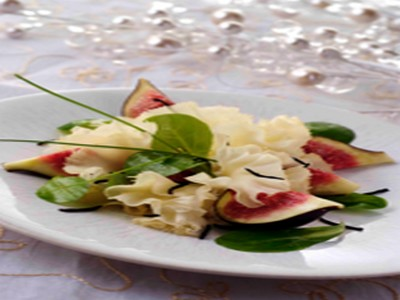 - 5Répartir les figues tièdes et les rosettes de Tête de Moine AOC.Saupoudrer ces dernières de copeaux de truffe.