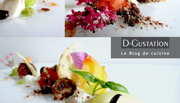 Dresser sur assiette, grâce à la poche à douille, un beau boudin de crème de mozzarella que vous allez garnir tout le long, de morceaux de tomates jaunes, du jus des tomates (préalablement conservé), des billes de tomates vertes, de quelques olives noires.