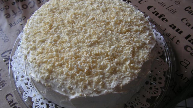 Répartir le reste de crème sur le dessus et le tour du gâteau. Râper la tablette de chocolat sur le dessus du gâteau.