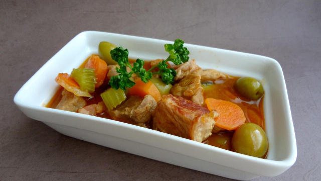 Incorporer carottes, céleri et olives au bout d'une heure et poursuivre la cuisson encore une demi-heure. Oter le couvercle pour finir la cuisson si la sauce ne nappe pas assez.