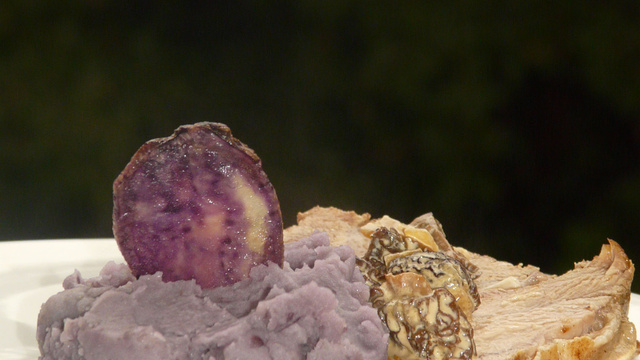 Éplucher la dernière. La couper en tranches très fines et laisser tremper les tranches 1/4 d'heure dans l'eau pour ôter le plus d'amidon possible. Puis faire frire les tranches dans de l'huile très chaude pour obtenir des chips violettes!