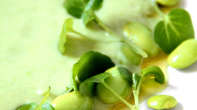 Servez la soupe décorée de feuilles de coriandre fraîches ou de cresson, de quelques fèves cuites entières et d'un filet d'huile de sésame