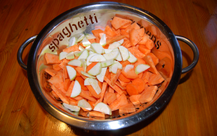 Coupez en rondelles très fines les carottes, la patate douce et les courgettes.
