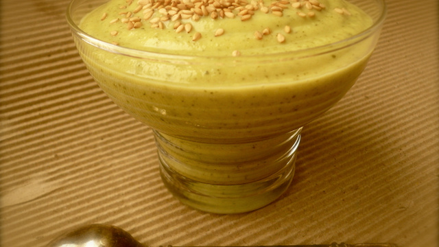 - 4Verser dans quatre verrines.Parsemer de graines de sésame.Placer au frigo au moins une heure et sortir au dernier moment.