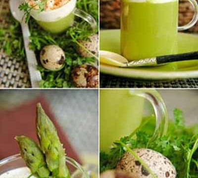 Comment résister à l'appel du printemps quand la nature se réveille et que les étals des primeurs se remplissent de verdure... une façon de sortir de la torpeur de l'hiver tout en douceur. Alors pourquoi pas un velouté d'asperges accompagné d'une crème dans laquelle on fait infuser une tranche de jambon cru.