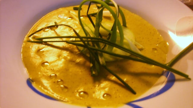 Créer un bouquet qui tient grâce à un nœud de ciboulette. - 4Mettre le velouté réchauffé pendant 2 minutes sur le feu, dans une assiette creuse.Poser la pomme avec le bouquet et les arceaux d'oignons dans ses entailles.