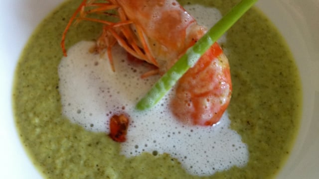 Dans une assiette creuse, déposer au fond de l'assiette un peu de velouté de brocolis puis faire une base avec deux crevettes puis ajouter celle avec tête. - 3
