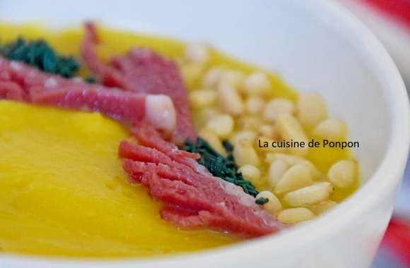 3Ajouter un peu de lait si le velouté est trop épais. Servir ce velouté dans des bols accompagné de filet de magret finement émincé, quelques pignons et spiruline.