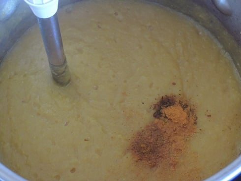 2Ajouter un fond d'eau et toutes les épices. Laisser sous pression pendant 10min. Lâcher la pression et mixer le tout. Vérifier l’assaisonnement.