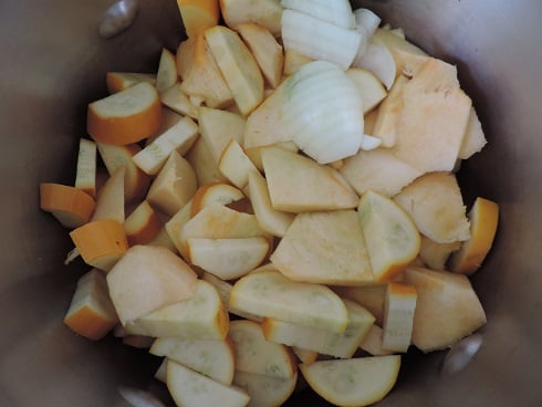 1Laver, couper tous les légumes en gros dés et les placer dans la cocotte minute.