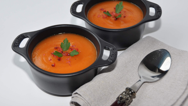 Servir bien chaud, avec les baies roses et les pluches de persil plat pour la déco. Enfin un velouté qui a du caractère !