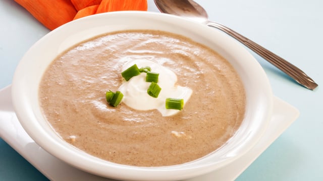 Ajouter la crème, ôtez le sens inverse et mixer 50 sec vitesse 8. Mettre dans vos assiettes creuses et ajouter des morceaux de foie gras.