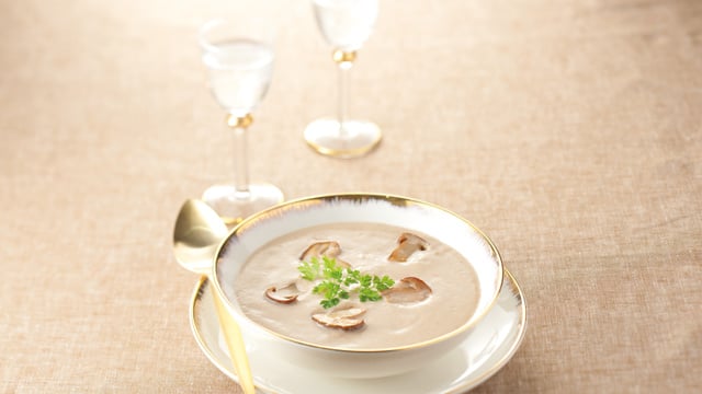 Nettoyez et coupez (si besoin) les champignons, faites-les revenir avec un peu de beurre, assaisonnez puis servez sur le velouté.