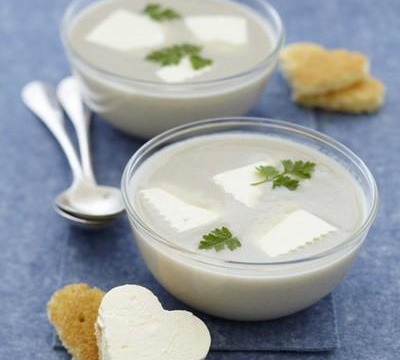 Ajoutez la crème liquide dans la casserole, laissez cuire encore 6 à 8 min puis mixez le tout pour obtenir un velouté onctueux. Versez le velouté très chaud dans des bols ou des coupelles, déposez des fines tranches de Caprice des Anges dessus, décorez avec des pluches de cerfeuil et servez avec les toasts coeur.