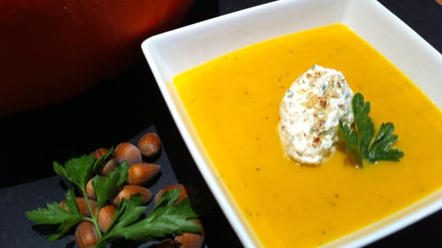 Un chaud-froid entre le velouté de courge relevé de curry et la crème chantilly au persil plat et aux noisettes concassées qui apportent un léger croquant pour une recette de saison