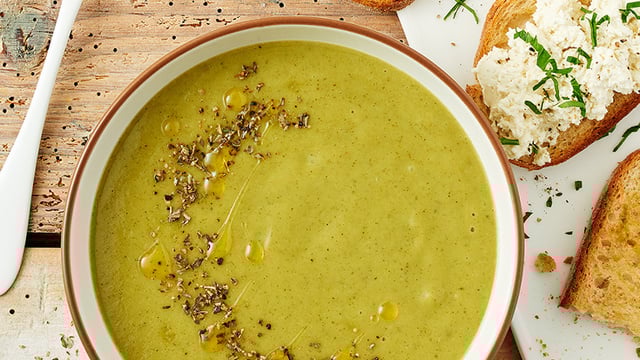 Mixer le velouté avec 1 càc de fromage frais jusqu’à ce qu’il soit lisse. Saler, poivrer. Servir.