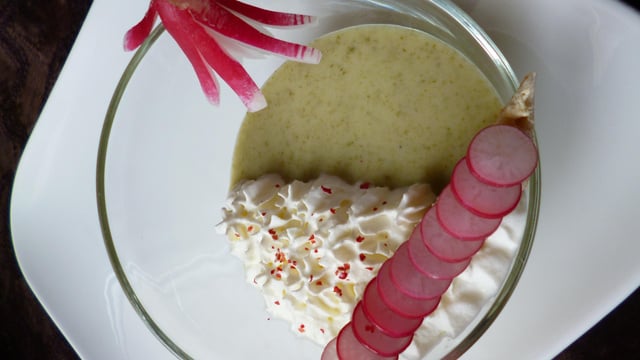 Versez le velouté dans des verrines transparentes et ajoutez un peu de chantilly au lard par-dessus. Décorez d'un radis joliment taillé et de baies roses concassées. Servez de suite avec une mouillette de pain aux radis roses.