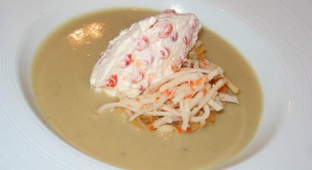 Monter la crème liquide en chantilly puis y incorporer les perles de pamplemousse. Mettre une cuillère de surimi/carottes/lentilles au centre d'une assiette creuse. Déposer une quenelle de chantilly aux perles dessus puis verser le velouté autour.