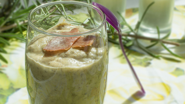 Dresser la soupe dans des bols et parsemer de chips de jambon.