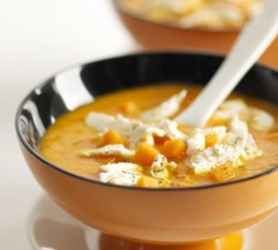 Un velouté de potiron onctueux et ses copeaux de fromage.