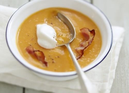 Servez le velouté fumant avec une quenelle de chantilly au Carré Frais et des chips de bacon.