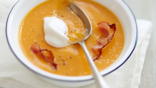 Servez le velouté fumant avec une quenelle de chantilly au Carré Frais et des chips de bacon.
