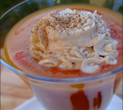 Montage : Verser le velouté de potiron dans des coupes. Au centre verser la purée de poivrons. Ajouter une quenelle de chantilly au fois gras, ou la déposer avec une poche à douille pour une jolie présentation. Saupoudrer de 4-épices si vous le souhaitez. Servir aussitôt.