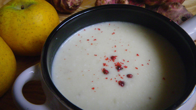 Le fait de mettre de la pomme dans cette soupe, change complètement le goût des topinambours pour le plus grand bonheur des petits et des grands.