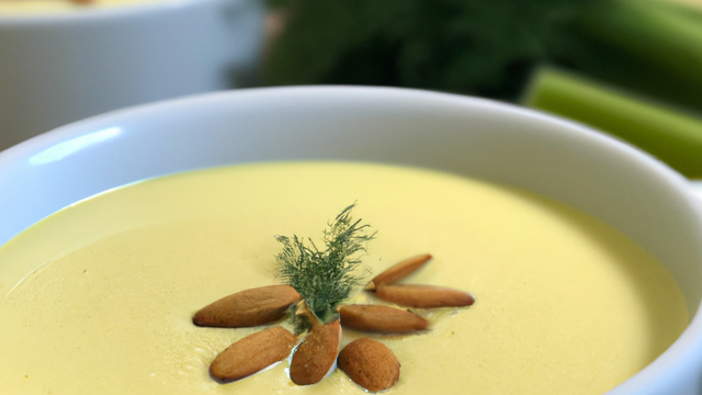Mixer finement avec 1 à 2 cuillers à soupe de purée d'amande (magazin bio) suivant la texture recherchée rectifier l'assaisonnement, servir chaud avec les plumets ciselés en déco.