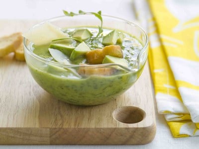 Au moment de servir, détailler la chair de l'avocat restant en petits dés, remplir les bols de velouté glacé et parsemer de dés d'avocat, de croûtons et de copeaux de parmesan.