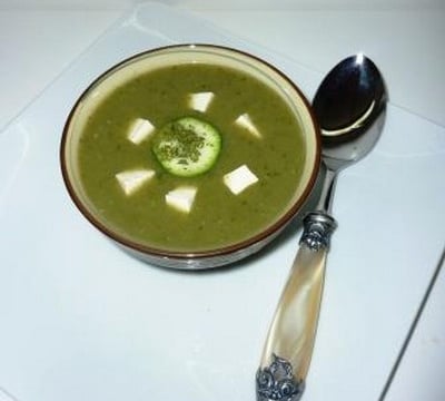 Vous pourrez alors dégustez ce velouté en entrée dans un bol décoré de quelques brins d'herbe et des lamelles de courgette.