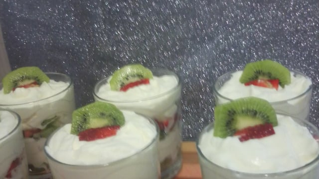 prendre les vérine mètre une couche de fraise kiwi puis ajouter la chantilly refaire pareille puis mètre au frais jusqu'au service.