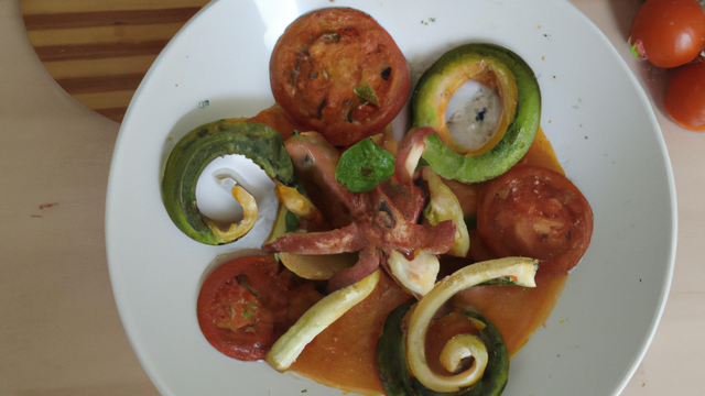 Mixer un second appareil comprenant : la courgette crue et coupée en petits morceaux, la tomate et l'ail coupés en morceaux, assaisonnez avec le piment, sel et poivre.
