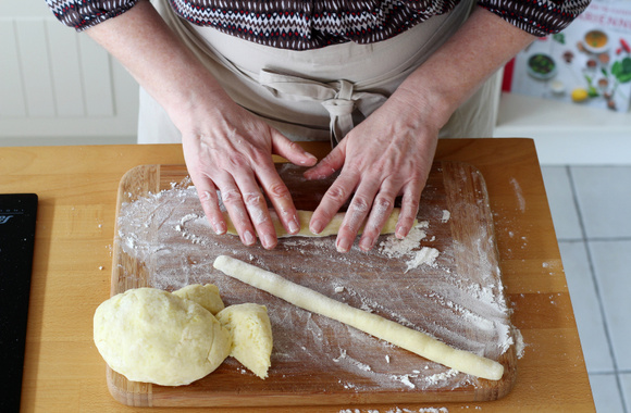 4Farinez légèrement votre plan de travail, détaillez la pâte en morceaux puis roulez chaque morceau en boudins d’environ 1,5 cm de diamètre.
